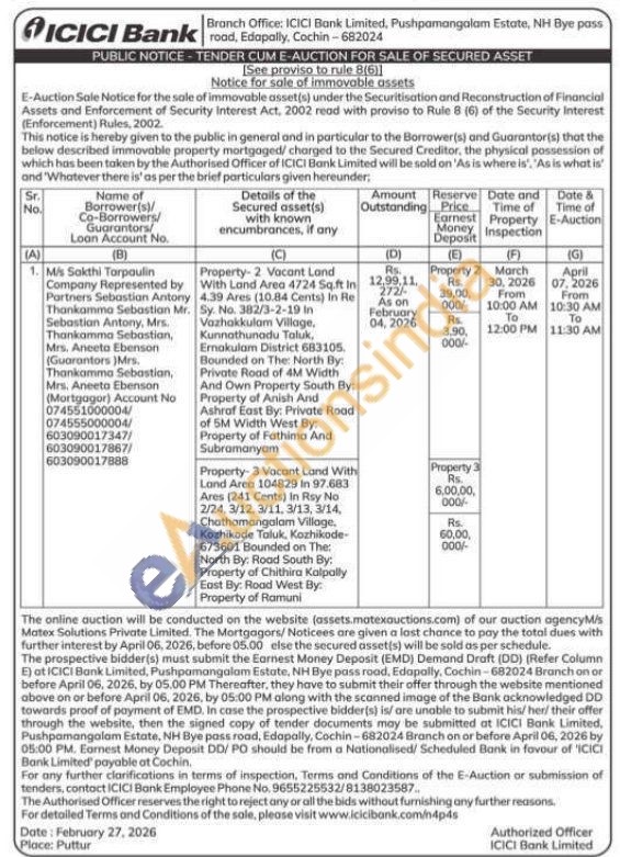 Property-2 Vacant Land With Land Area 4724 Sq.ft In 4.39 Ares (10.84 Cents) In Re Sy. No. 382/3-2-19 in Vazhakkulam Village, Kunnathunadu Taluk, Ernakulam District 683105. Bounded on The North By: Private Road of 4M Width And Own Property South By: Property of Anish And Ashraf East By: Private Road of 5M Width West By: Property of Fathima And Subramanyam