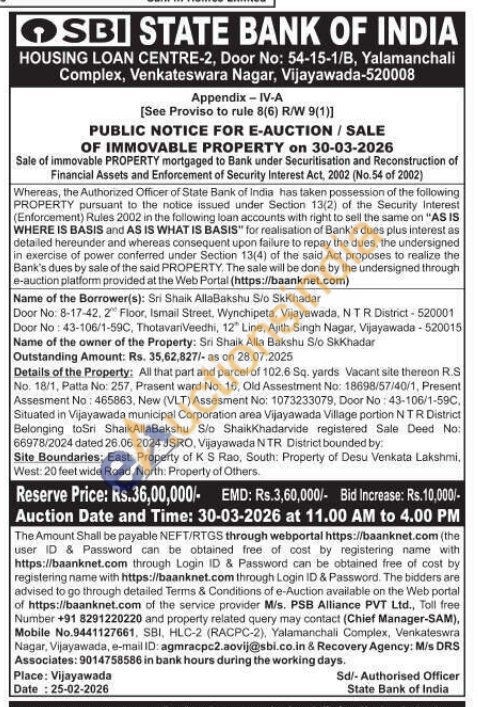 Details of the Property: All that part and parcel of 102.6 Sq. yards Vacant site thereon R.S No. 18/1, Patta No: 257, Prasent ward No: 16, Old Assestment No: 18698/57/40/1, Present Assesment No: 465863, New (VLT) Assesment No: 1073233079, Door No: 43-106/1-59C, Situated in Vijayawada municipal Corporation area Vijayawada Village portion NTR District Belonging toSri ShaikAllaBakshu S/o ShaikKhadarvide registered Sale Deed No: 66978/2024 dated 26.06.2024 JSRO, Vijayawada NTR District bounded by: Site Boundaries: East Property of K S Rao, South: Property of Desu Venkata Lakshmi, West: 20 feet wide Road, North: Property of Others.