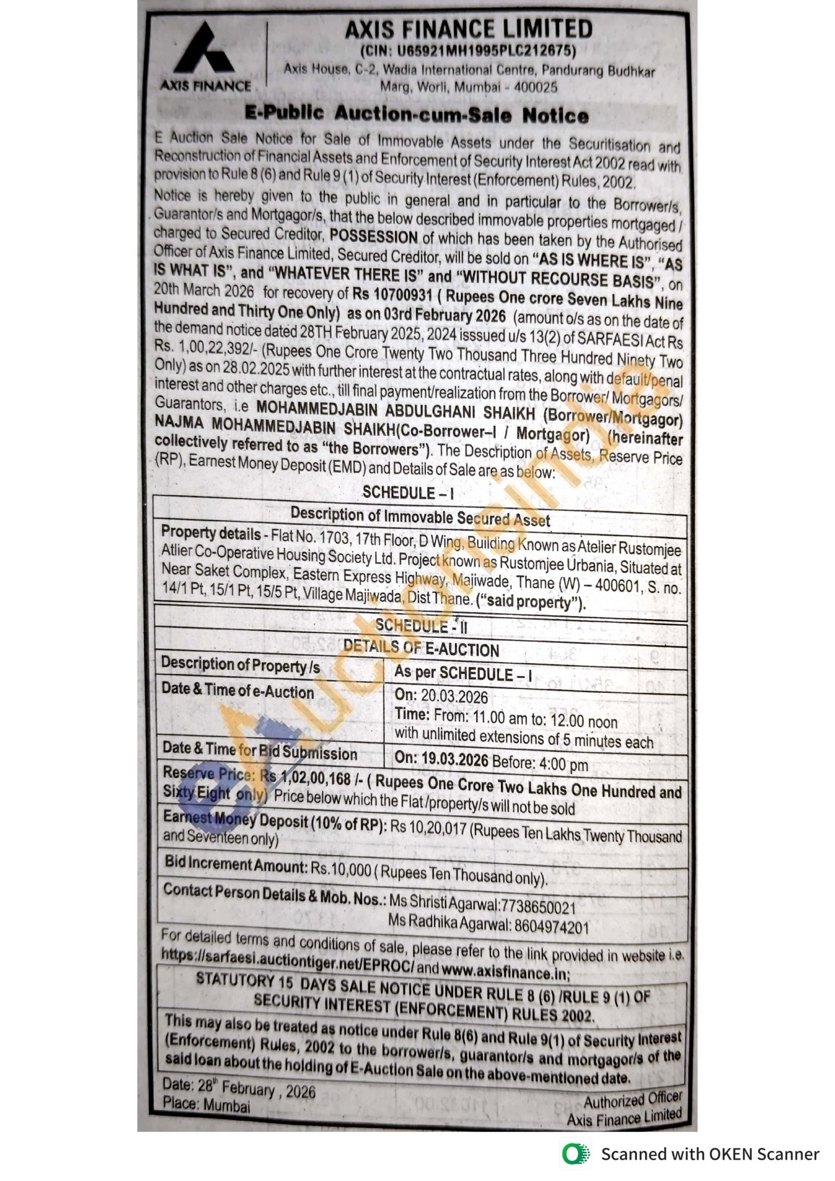 Property details-Flat No. 1703, 17th Floor, D Wing, Building Known as Atelier Rustomjee Atlier Co-Operative Housing Society Ltd. Project known as Rustomjee Urbania, Situated at Near Saket Complex, Eastern Express Highway, Majiwade, Thane (W)-400601, S. no. 14/1 Pt, 15/1 Pt, 15/5 Pt, Village Majiwada, Dist Thane. ("said property").