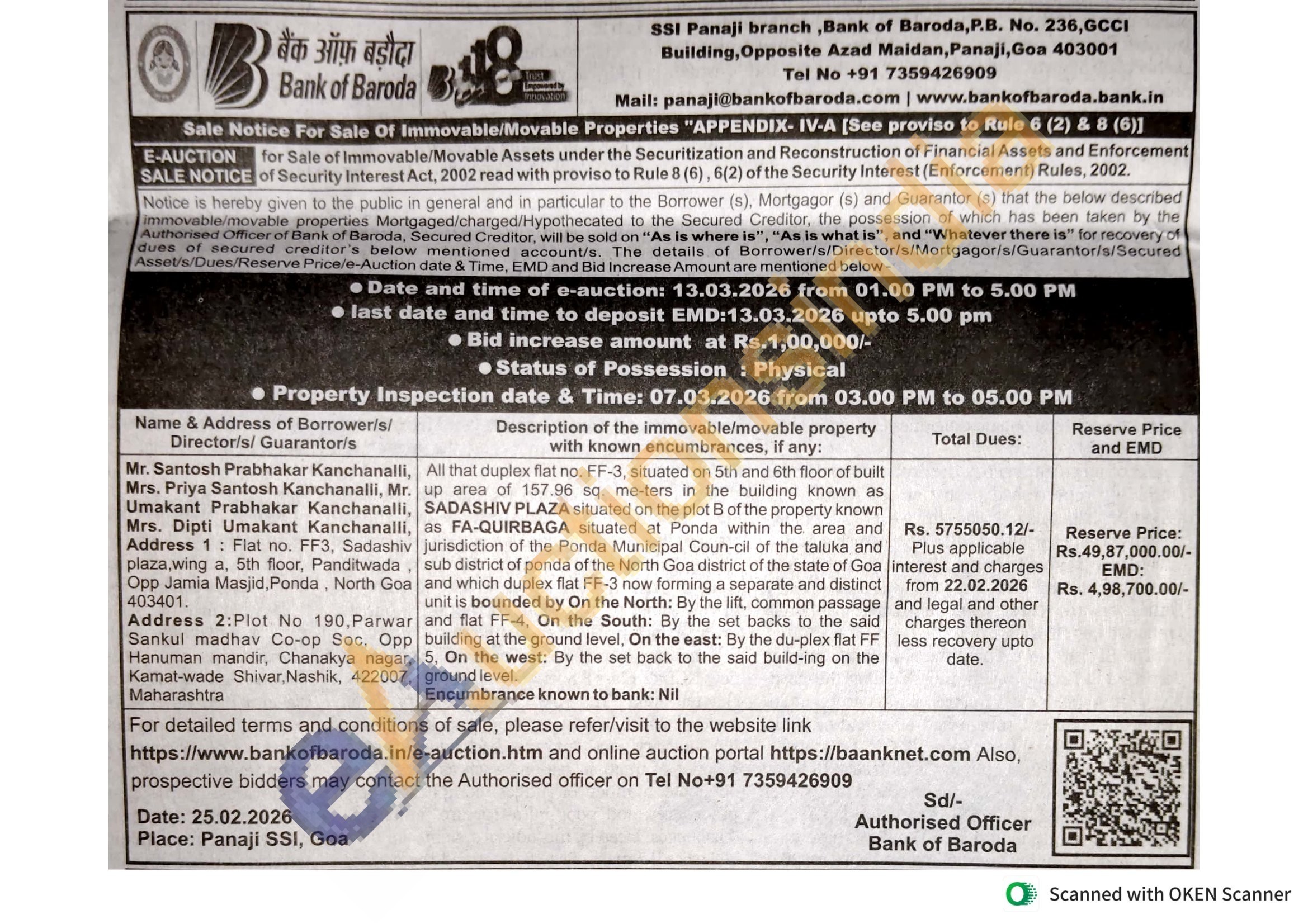 All that duplex flat no. FF-3, situated on 5th and 6th floor of built up area of 157.96 sq. me-ters in the building known as SADASHIV PLAZA situated on the plot B of the property known as FA-QUIRBAGA situated at Ponda within the area and jurisdiction of the Ponda Municipal Coun-cil of the taluka and sub district of ponda of the North Goa district of the state of Goa and which duplex flat FF-3 now forming a separate and distinct unit is bounded by On the North: By the lift, common passage and flat FF-4, On the South: By the set backs to the said building at the ground level, On the east: By the du-plex flat FF 5, On the west: By the set back to the said build-ing on the ground level. Encumbrance known to bank: Nil