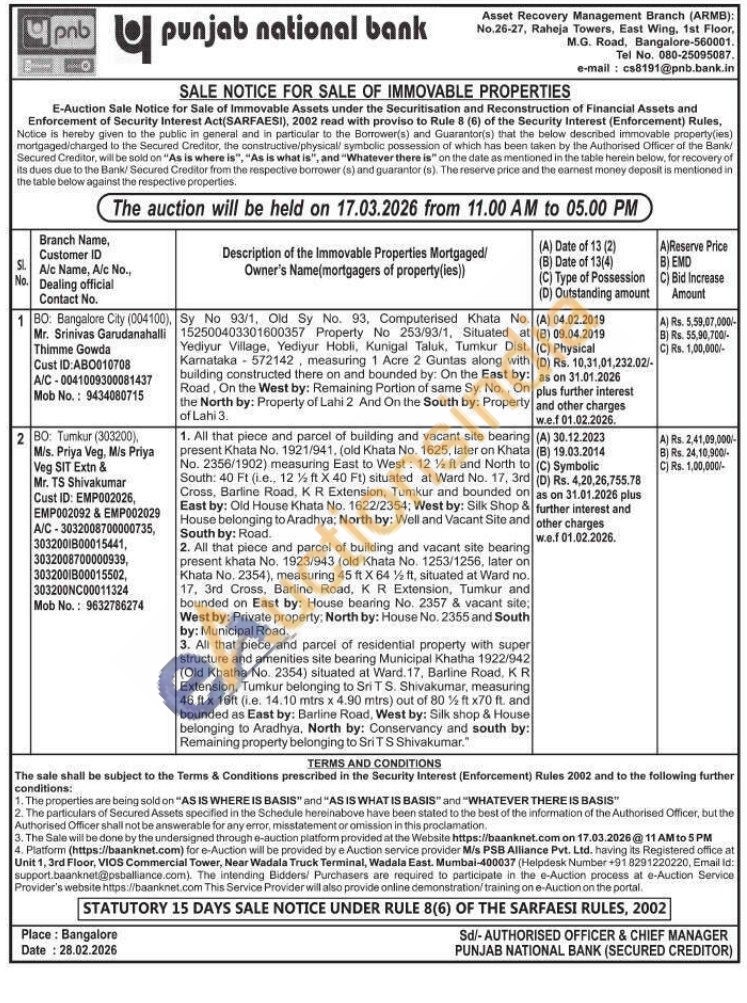All that piece and parcel of building and vacant site bearing present khata No. 1923/943 (old Khata No. 1253/1256, later on Khata No. 2354), measuring 45 ft X 64% ft, situated at Ward no. 17, 3rd Cross, Barline Road, KR Extension, Tumkur and bounded on East by: House bearing No. 2357 & vacant site: West by: Private property: North by: House No. 2355 and South by: Municipal Road. 3. All that piece and parcel of residential property with super structure and amenities site bearing Municipal Khatha 1922/942 (Old Khatha No. 2354) situated at Ward. 17, Barline Road, KR Extension, Tumkur belonging to Sri TS. Shivakumar, measuring 46 ft x 16ft (i.e. 14.10 mtrs x 4.90 mtrs) out of 80% ft x70 ft. and bounded as East by: Barline Road, West by: Silk shop & House belonging to Aradhya. North by: Conservancy and south by: Remaining property belonging to Sri T S Shivakumar