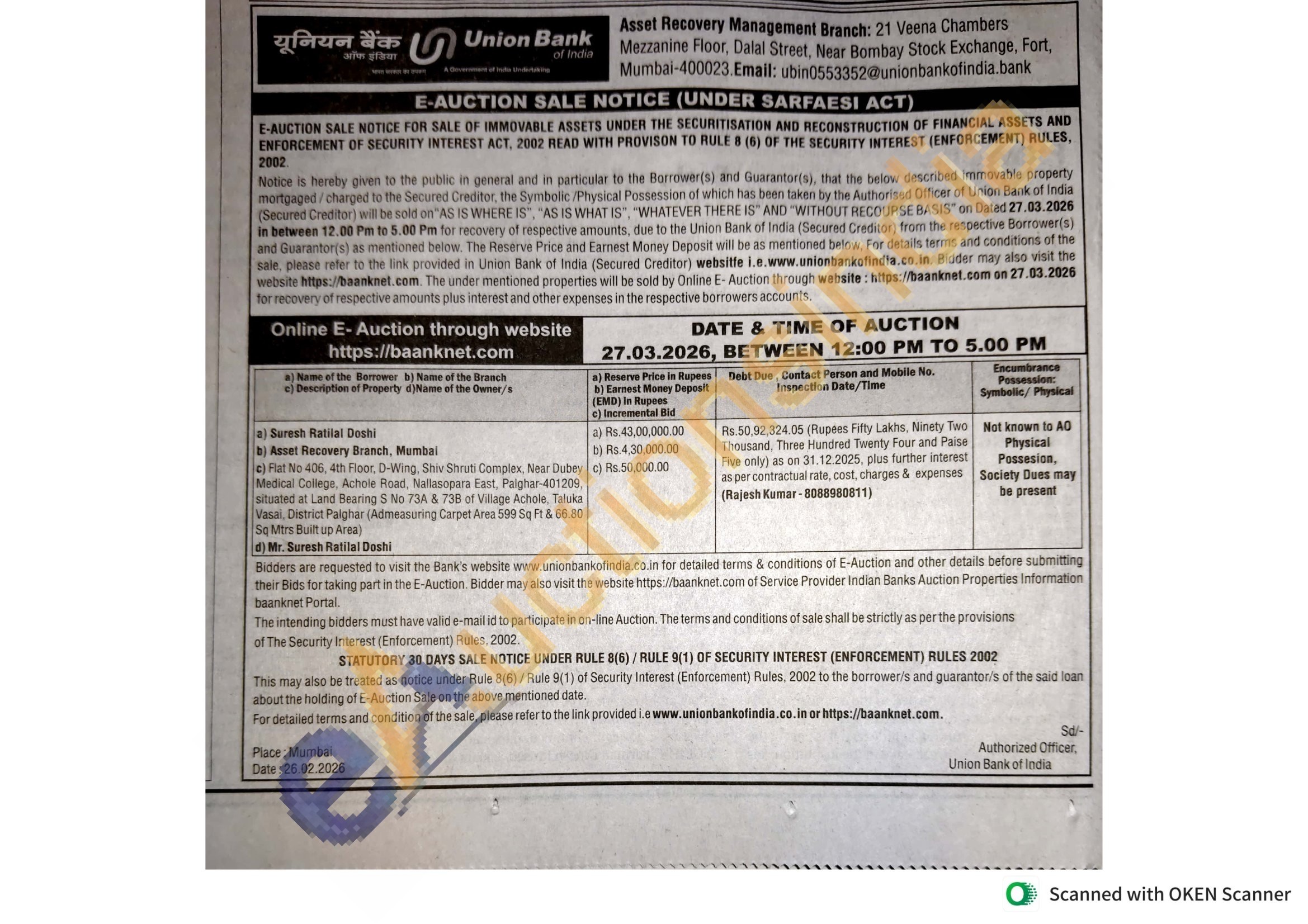 Flat No 406, 4th Floor, D-Wing, Shiv Shruti Complex. Near Dubey Medical College, Achole Road, Nallasopara East, Palghar-401209, situated at Land Bearing S No 73A & 738 of Village Achole, Taluka Vasal District Palghar (Admeasuring Carpet Area 599 Sq Ft & 66.80 Sa Mtrs Built up Area)