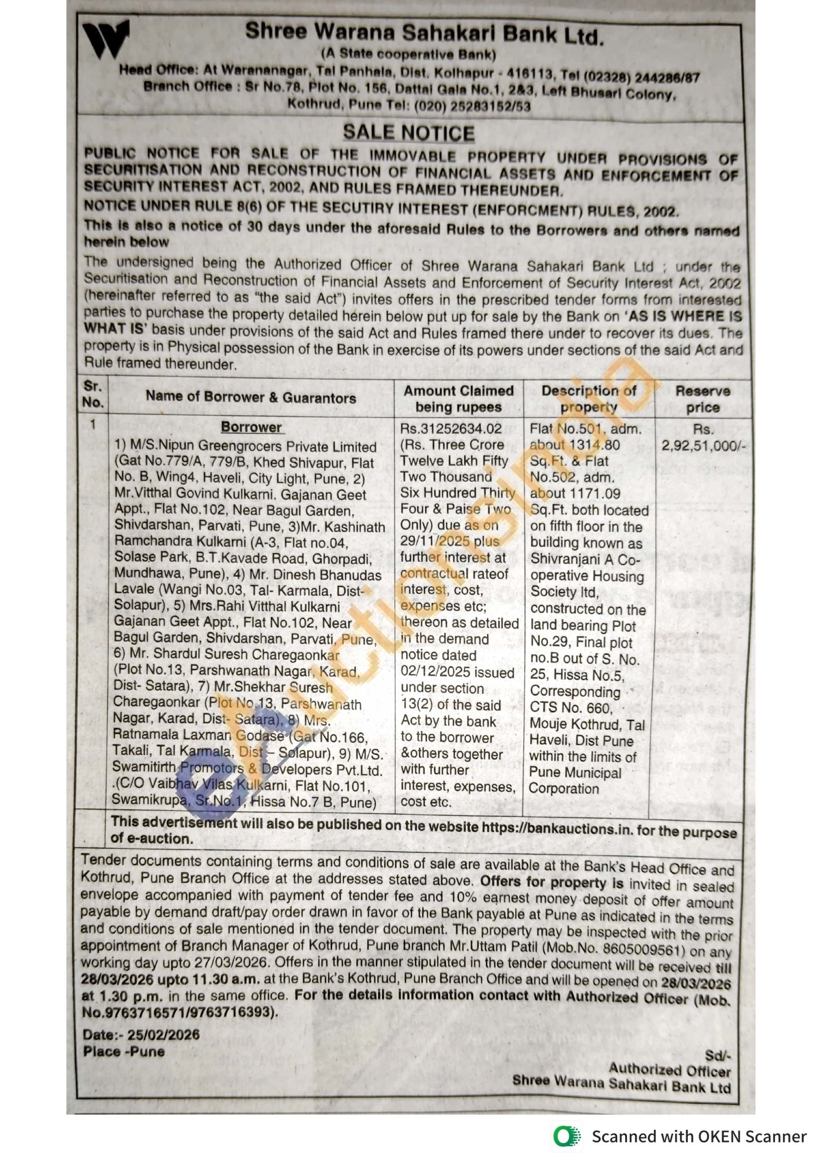 2) All piece and parcel of flat property bearing Flat No. 501 adm. about 1520.19 sq.ft.along with parking area in redevelopment project situated on the land bearing plot no. 13, Adwait Co. Op. Housing Society S.No. 46/5, C.T.S. No. 361/11, at Mouje Erandwane, Pune.