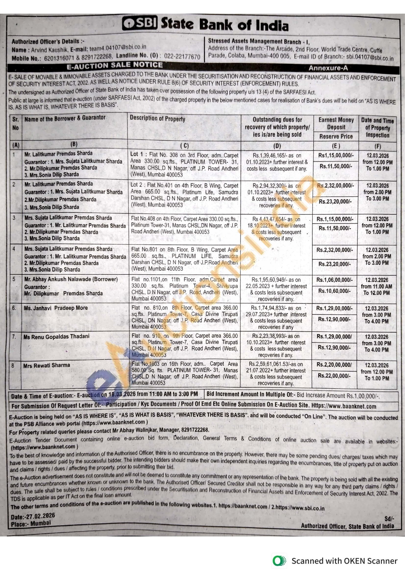 Flat No.408 on 4th Floor, Carpet Area 330.00 sq.fts., Platinum Tower-31, Manas CHSL, DN Nagar, off J.P. Road Andheri (West), Mumbai 400053