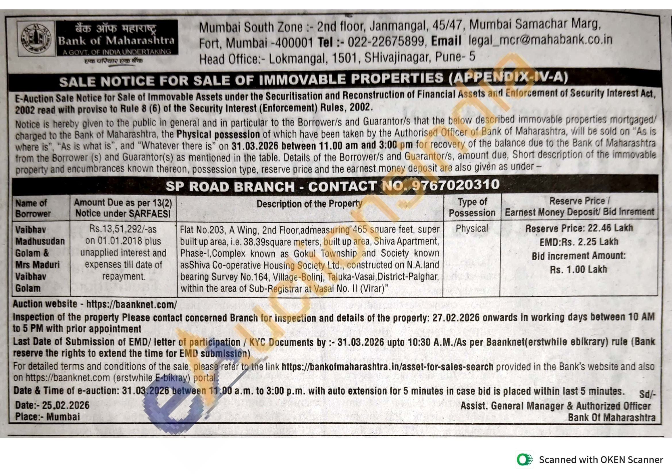 Flat No.203, A Wing, 2nd Floor,admeasuring 465 square feet, super built up area, i.e. 38.39square meters, built up area, Shiva Apartment, Phase-I, Complex known as Gokul Township and Society known asShiva Co-operative Housing Society Ltd., constructed on N.A.land bearing Survey No.164, Village-Bolinj, Taluka-Vasai, District-Palghar, within the area of Sub-Registrar at Vasai No. II (Virar)"