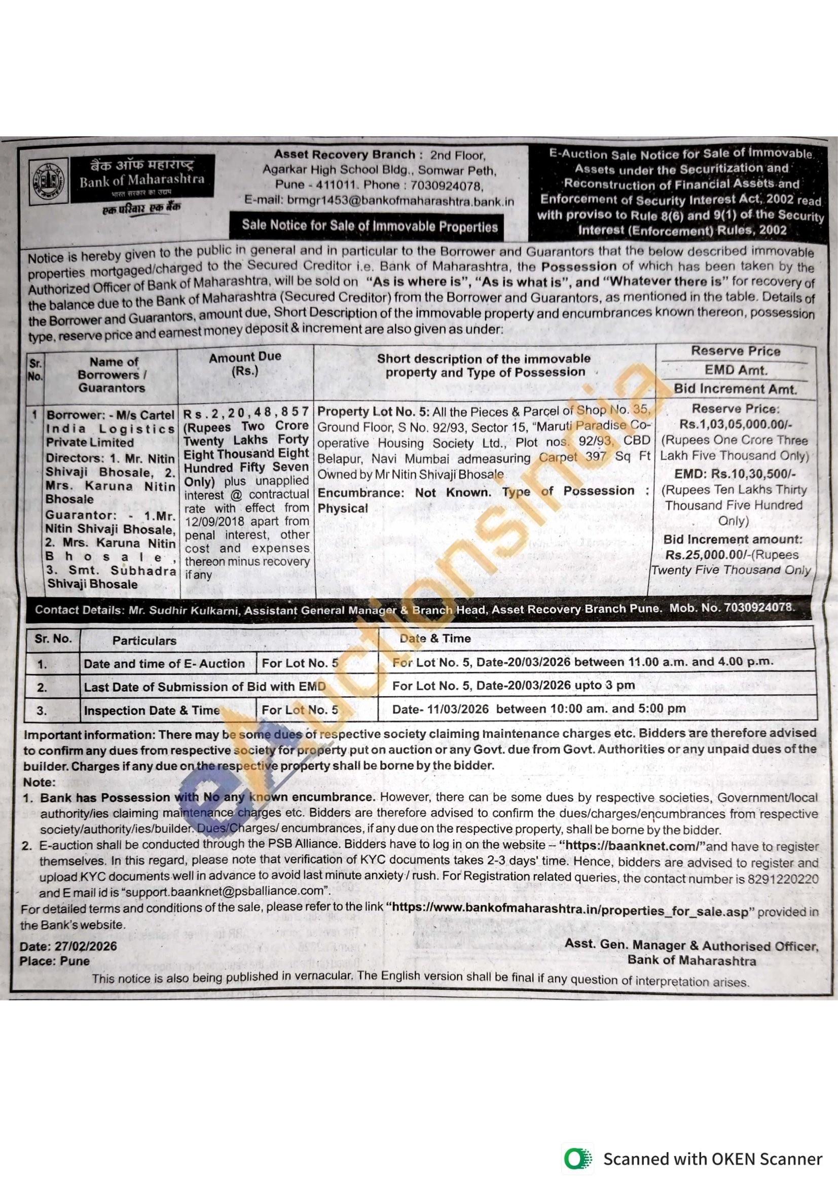 Contact Details: Mr. Sudhir Kulkarni, Assistant General Manager & Branch Head, Asset Recovery Branch Pune. Mob. No. 7030924078.