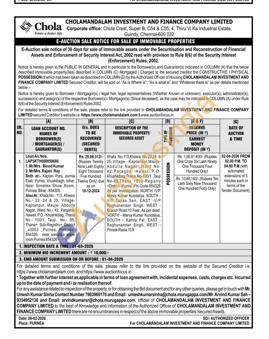 Khata No-113,Khesra No-23,24 & 25. Village -Kaptanpur, Mauja-Abdulla Nagar Ward No-42, Paragna-Haweli, P.O-Khushkibag, Thana No-100/1 Tauji No-85, Thana +Sub-Registry +District-Purnia Pin Code-854326 As per Investigation, NORTH -V/P Manoj Kumar Kundaliya, SOUTH -VIP Tapas Sen, EAST -V/P Raghunandan Singh, WEST-Branch Road 10 Feet As per deed. NORTH - Manoj Kumar Kundaliya, SOUTH Kamla Pal, EAST-Raghunandan Singh, WEST-Private Rasta 10 ft