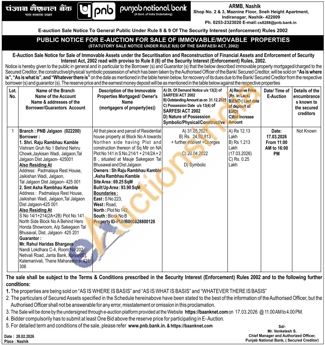 All that piece and parcel of Residential house property at Block No A towards Northen side having Plot and construction thereon of Sq Mtr on NA Plot No 141 in S No.214/1+214/2A+2 B, situated at Mauje Sakegaon Tal Bhusawal and Dist Jalgaon