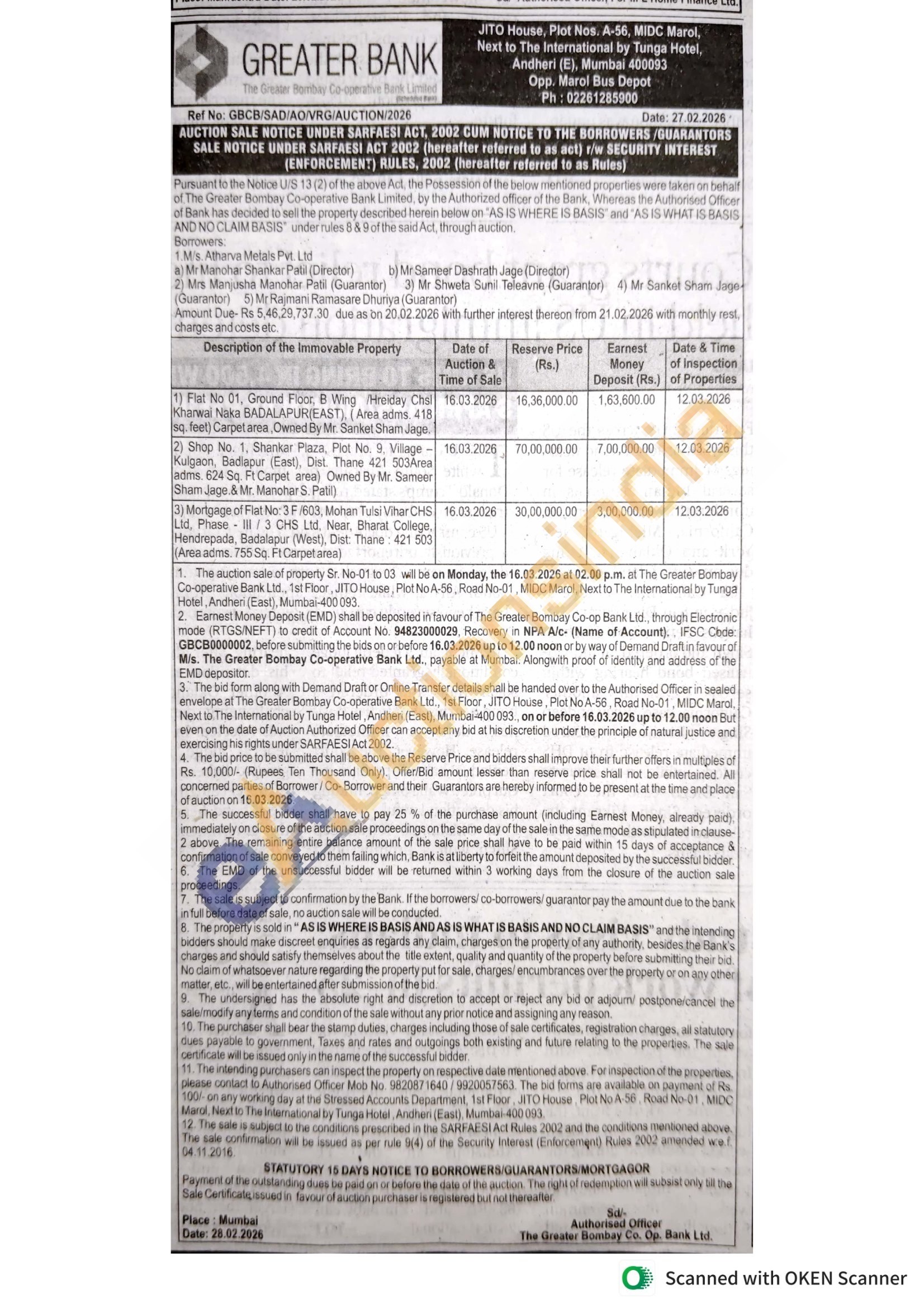 Contact Authorised Officer Mob No. 9820871640/9920057563