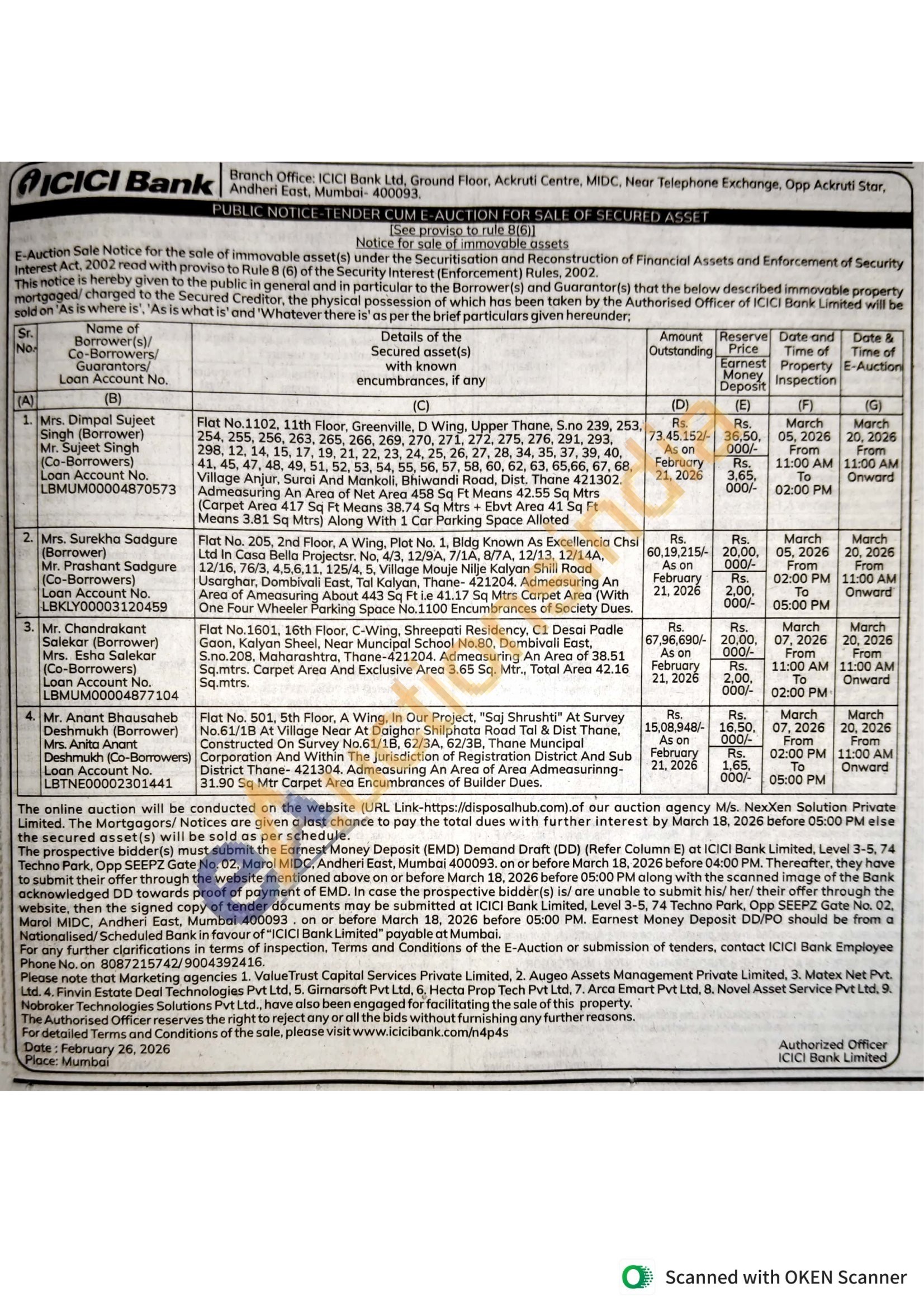 Flat No. 205, 2nd Floor, A Wing, Plot No. 1, Bldg Known As Excellencia Chsl Ltd In Casa Bella Projectsr. No, 4/3, 12/9A, 7/1A, 8/7A, 12/13, 12/14A, 12/16, 76/3, 4,5,6,11, 125/4, 5, Village Mouje Nilje Kalyan Shill Road Usarghar, Dombivali East, Tal Kalyan, Thane- 421204. Admeasuring An Area of Ameasuring About 443 Sq Ft i.e 41.17 Sq Mtrs Carpet Area (With One Four Wheeler Parking Space No.1100 Encumbrances of Society Dues.