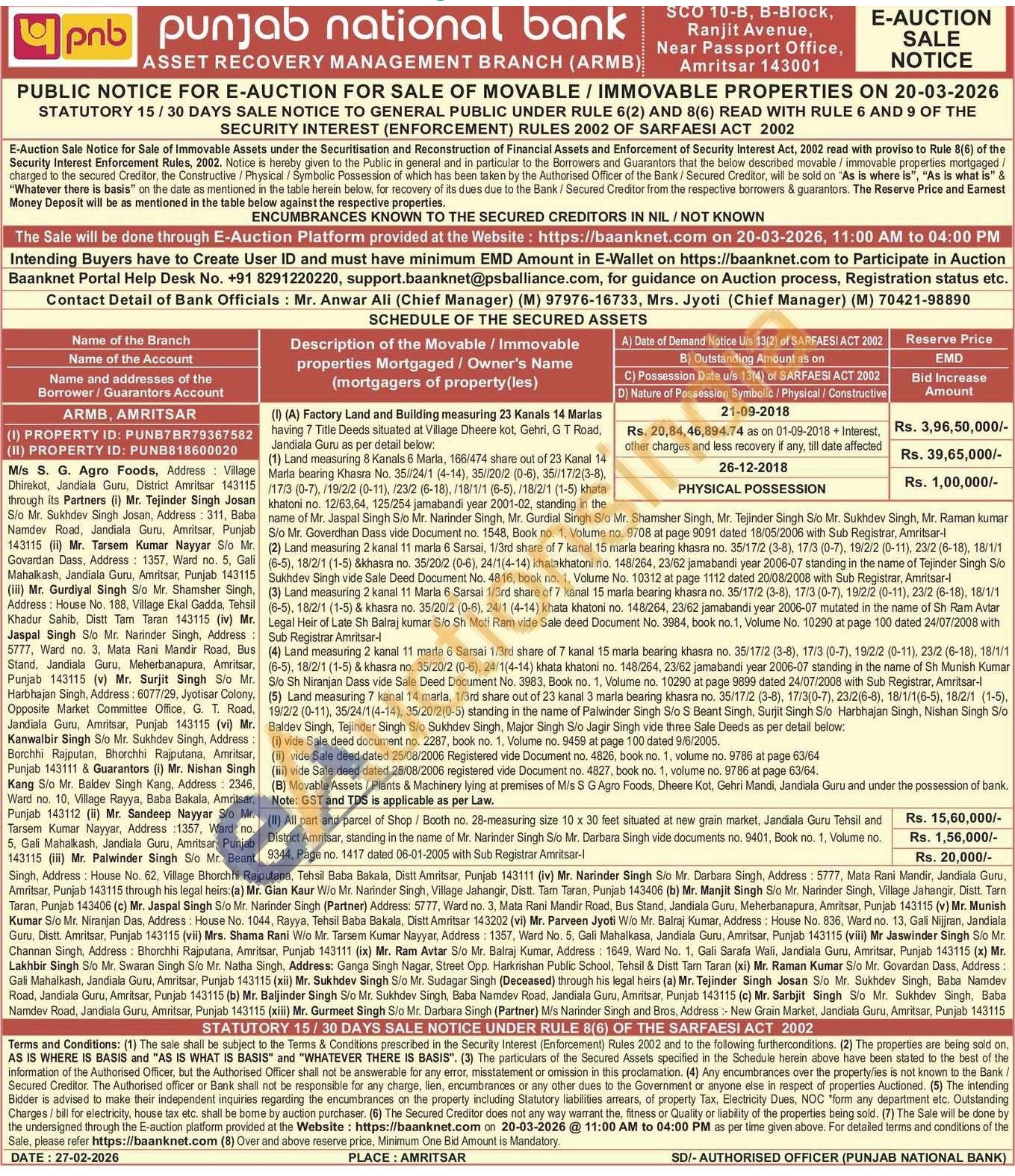 (II) All part and parcel of Shop/Booth no. 28-measuring size 10 x 30 feet situated at new grain market, Jandiala Guru Tehsil and District Amritsar, standing in the name of Mr. Narinder Singh Sio Mr. Darbara Singh vide documents no. 9401, Book no. 1, Volume no. 9344, Page no. 1417 dated 06-01-2005 with Sub Registrar Amritsar-l