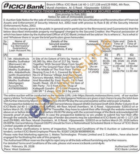 A Site of An Extent of 54% Sq. Yards or 45.360 Sq. Mtrs Out of 217 Sq. Yards Together With Second Shop From South Side of The Ground Floor And Two Shops In The Middle of The First Floor Therein Bearing D.no.3-6-1, Covered By Ward No.22 of Kovvur Village And Panchayat, Kavvuru Mandal, West Godavari District And Bounded By: East: Road-74-5 Feet South: Road-26-0 Feet West: 1st Item of 4th Party-73-0 Feet North: Shop of Kallepalli Gandhi-27-0 Feet Property Size. 180 Sft 3 shops, UDS 54.5 Sq yards