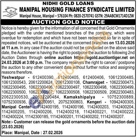 MANIPAL HOUSING FINANCE SYNDICATE LIMITED Gold Auctions Auction in Bengaluru