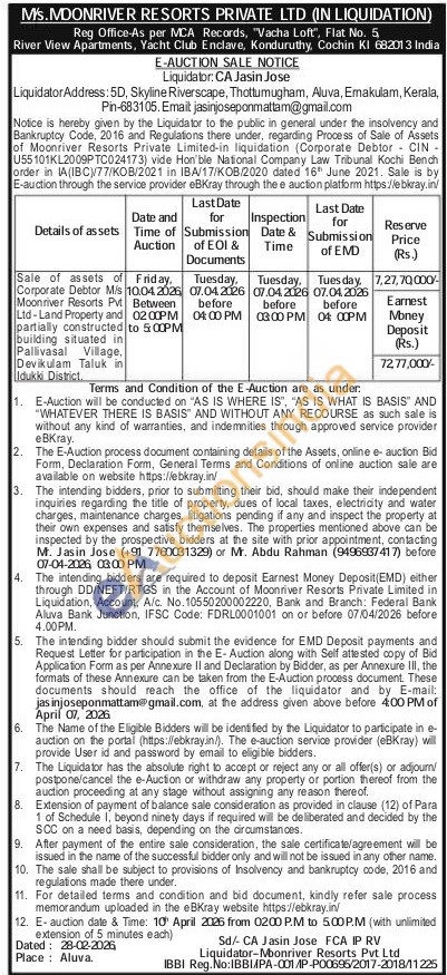 Sale of assets of Corporate Debtor M/s Moonriver Resorts Pvt Ltd-Land Property and partially constructed building situated in Pallivasal Village, Devikulam Taluk in Idukki District