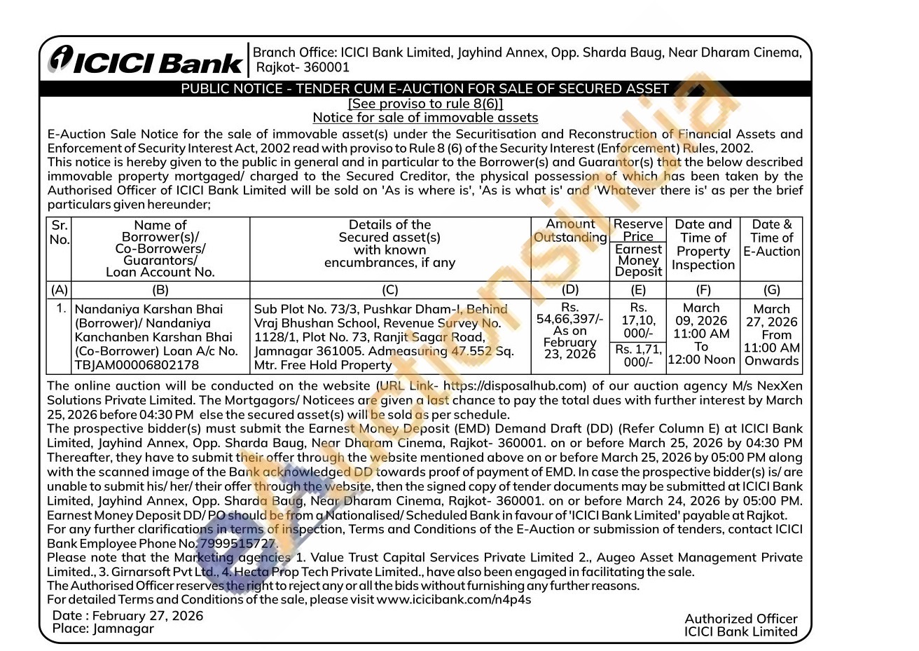 Sub Plot No. 73/3, Pushkar Dham-I, Behind Vraj Bhushan School, Revenue Survey No. 1128/1, Plot No. 73, Ranjit Sagar Road, Jamnagar 361005. Admeasuring 47.552 Sq Mtr. Free Hold Property