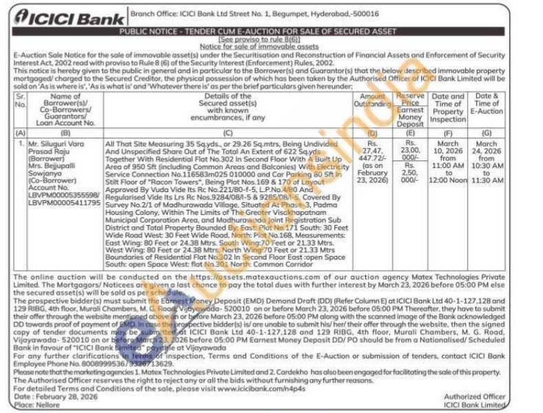 All That Site Measuring 35 Sqyds, or 29.26 Sq.mtrs, Being Undivided And Unspecified Share Out of The Total An Extent of 622 Sq.yds Together With Residential Flat No.302 In Second Floor With A Built Up Area of 950 Sft (including Common Areas and Balconies With Electricity Service Connection No.116583m025 010000 and Car Parking 80 Sft in Stilt Floor of "Racon Towers", Being Plot Nos. 169 & 170 of Layout Approved By Vuda Vide Its Rc No. 221/80-1-5, LP.No.4/80 And Regularised Vide Its Lrs Rc Nos.9284/08/1-5 & 9285/08/1-5, Covered By Survey No.2/1 of Madhurawada Village, Situated At Phase-3, Padma Housing Colony, Within The Limits of The Greater Visakhapatnam Municipal Corporation Area, and Madhurawada Joint Registration Sub District and Total Property Bounded By: East: Plot No. 171 South: 30 Feet Wide Road West: 30 Feet Wide Road, North: Plot No. 168, Measurements: East Wing: 80 Feet or 24.38 Mtrs. South Wing:70 Feet or 21.33 Mtrs. West Wing: 80 Feet or 24.38 Mtrs. North Wing:70 Feet or 21.33 Mtrs Boundaries of Residential Flat No.302 In Second Floor Eastcopen Space South: open Space West: flat No.301 North: Common Corridor
