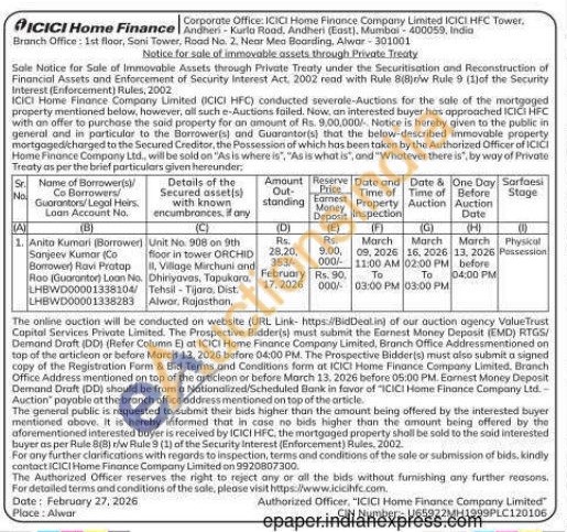 Unit No. 908 on 9th floor in tower ORCHID it, Village Mirchuni and Dhiriyavas, Topukara Tehsil - Tijara, Dist. Alwar, Rajasthan