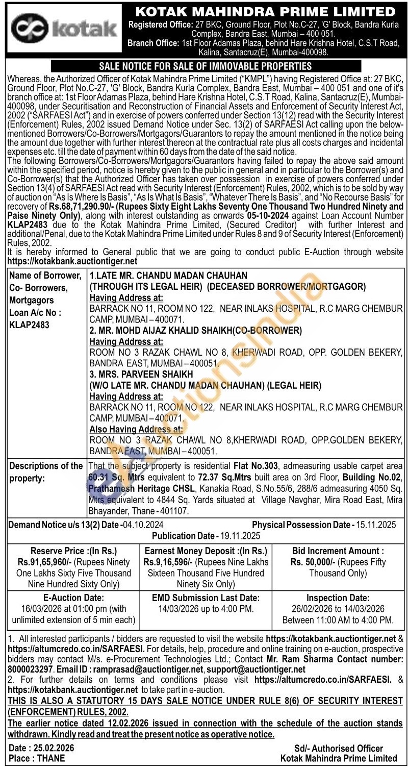 That the subject property is residential Flat No.303, admeasuring usable carpet area 60.31 Sq. Mtrs equivalent to 72.37 Sq.Mtrs built area on 3rd Floor, Building No.02, Prathamesh Heritage CHSL, Kanakia Road, S.No.55/6, 288/6 admeasuring 4050 Sq. Mtrs equivalent to 4844 Sq. Yards situated at Village Navghar, Mira Road East, Mira Bhayander, Thane-401107
