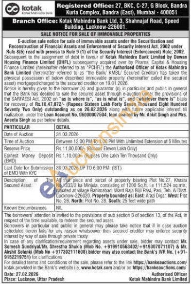 All that piece and parcel of property bearing Plot No.27. Khasra No.1333/2 ka Minjula, consisting of 1200 Sq.ft. le 111.524 sq.mir situated at village Rahimabad, Ward Raja Bijli Pasi, Pasi. Teh. & Dist Lucknow-226020 Property bounded as: East: Arazi Digar, West: Plot No. 26, North: Plot No. 28. South: 25 feet wide path