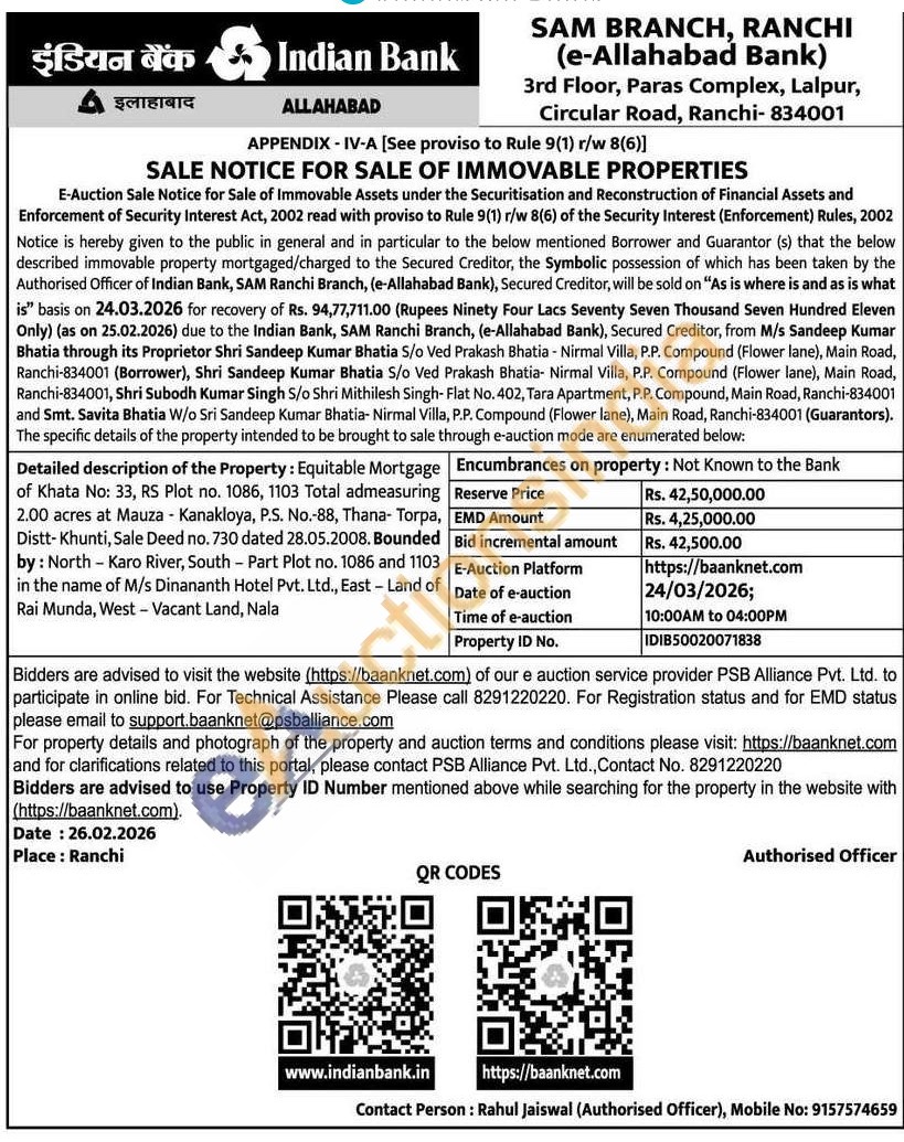 Detailed description of the Property: Equitable Mortgage of Khata No: 33, RS Plot no. 1086, 1103 Total admeasuring 2.00 acres at Mauza - Kanakloya, P.S. No.-88, Thana- Torpa, Distt-Khunti, Sale Deed no. 730 dated 28.05.2008. Bounded by: North - Karo River, South - Part Plot no. 1086 and 1103 in the name of M/s Dinananth Hotel Pvt. Ltd., East - Land of Rai Munda, West - Vacant Land, Nala