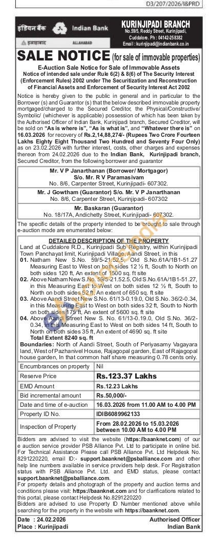 Land at Cuddalore R.D., Kurinjipadi Sub Registry, within Kurinjipadi Town Panchayat limit, Kurinjipadi Village, Aandi Street, in this 01. Natham New S.No. 59/5-21.52.5, Old S.No.61A/1B1-51.27 Measuring East to West on both sides 12% ft, South to North on both sides 120 ft. An extent of 1500 sq. ft site 02. Above Natham New S.No. 59/5-21.52.5, Old S.No. 61A/1B1-51.27, in this Measuring East to West on both sides 12% ft, South to North on both sides 52 ft, An extent of 650 sq. ft site 03. Above Aandi Street New S.No. 61/13-0.19.0, Old S.No. 36/2-0.34, in this Measuring East to West on both sides 32 ft, South to North on both sides 175 ft. An extent of 5600 sq. ft site 04. Above Aandi Street New S. No. 61/13-0.19.0, Old S.No. 36/2-0.34, in this Measuring East to West on both sides 14 ft, South to North on both sides 35 ft. An extent of 4690 sq. ft site. Total Extent 8240 sq. ft Boundaries: North of Aandi Street, South of Periyasamy Vagayara land, West of Pazhanivel House, Rajagopal garden, East of Rajagopal house garden, In that common half share measuring 0.78 cents only