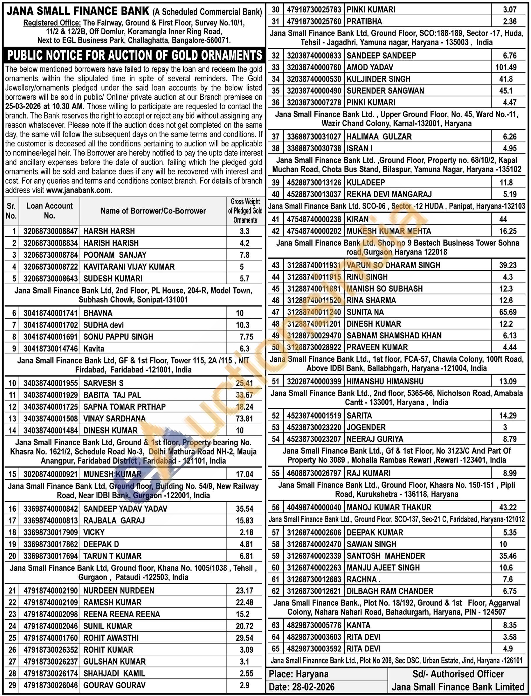 Jana Small Finance Bank Gold Auctions Auction in Sonipat