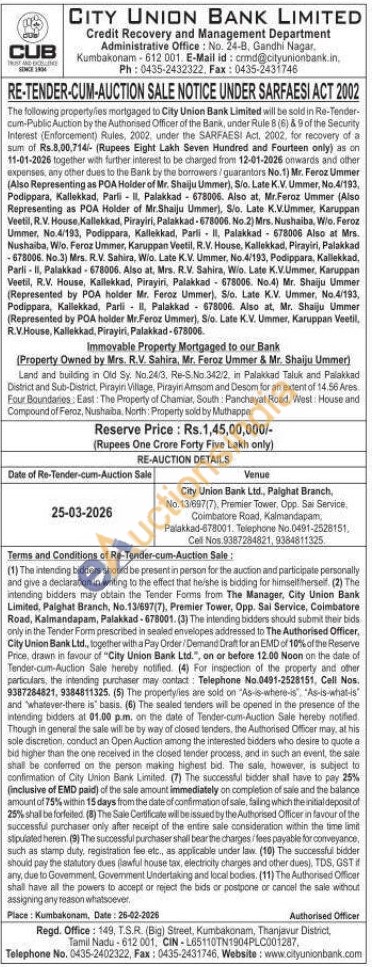Immovable Property Mortgaged to our Bank (Property Owned by Mrs. R.V. Sahira, Mr. Feroz Ummer & Mr. Shaiju Ummer) : Land and building in Old Sy. No.24/3, Re-S.No.342/2, in Palakkad Taluk and Palakkad District and Sub-District, Pirayini Village, Pirayin Amsom and Desom for an extent of 14.56 Ares. Four Boundaries: East: The Property of Chamiar, South: Panchayat Road, West: House and Compound of Feroz, Nushaiba, North: Property sold by Muthappe