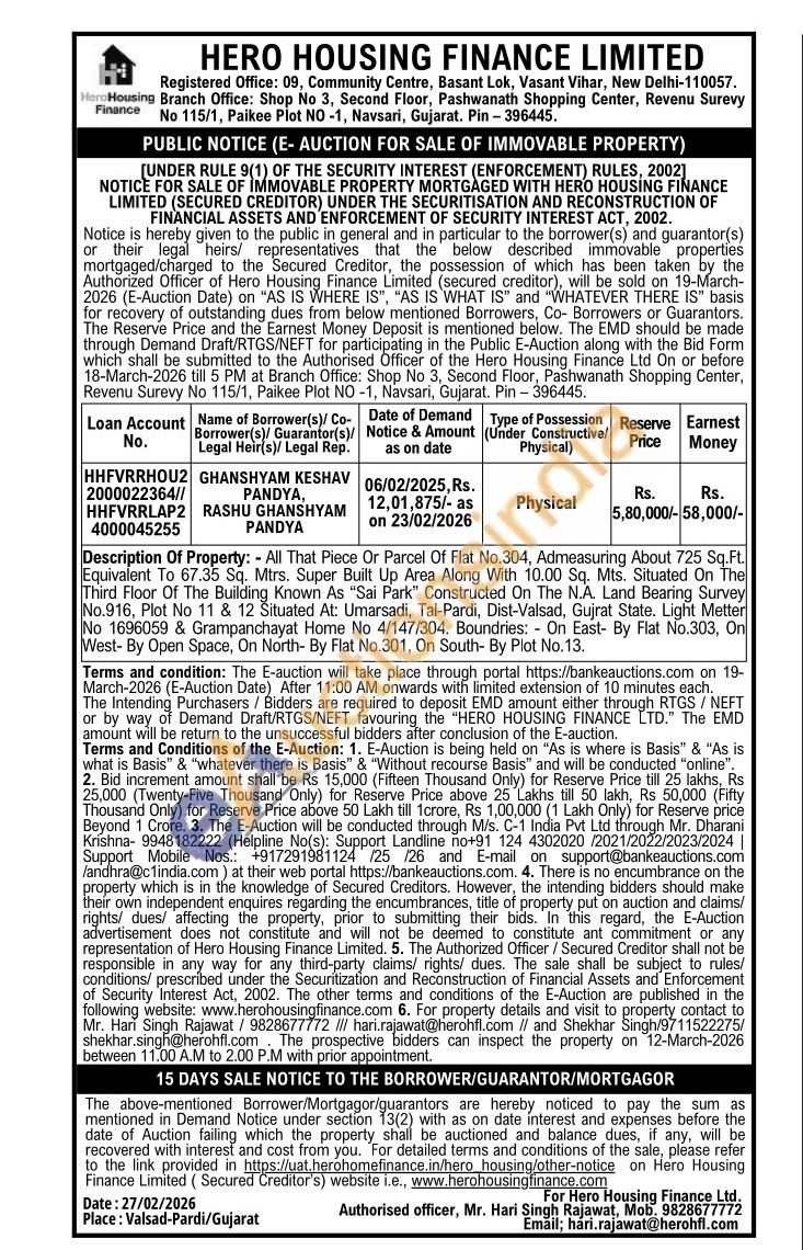 Description Of Property: All That Piece Or Parcel Of Flat No.304, Admeasuring About 725 Sq.Ft. Equivalent To 67.35 Sq. Mtrs. Super Built Up Area Along With 10.00 Sq. Mts. Situated On The Third Floor Of The Building Known As "Sai Park" Constructed On The N.A. Land Bearing Survey No.916, Plot No 11 & 12 Situated At: Umarsadi, Tal-Pardi, Dist-Valsad, Gujrat State. Light Metter No 1696059 & Grampanchayat Home No 4/147/304. Boundries: On East- By Flat No.303, On West-By Open Space, On North- By Flat No.301, On South- By Plot No. 13
