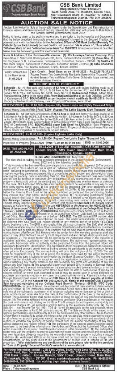 Schedule A: All that parts and parcels of 62 Ares of Land with factory building made up of 33.20 Ares in Re Survey No. 177/1-1, 24.74 Ares in Re. Survey No.177/f and 4.05 Ares in Re Survey No. 177/1-2, Old Survey No. 53/11, Block No. 13 of Kadampanad Village, Adoor Taluk Pathanamthitta District in the name of Mr. Prem Shaji and Saritha as per Sale Deed No. 227/2011 of Kadamponad SRO BOUNDARIES as per location sketch certificate No.821/2013:-North: Property of Mathai, South Pathway, East: Property of Prasanna, West: Road