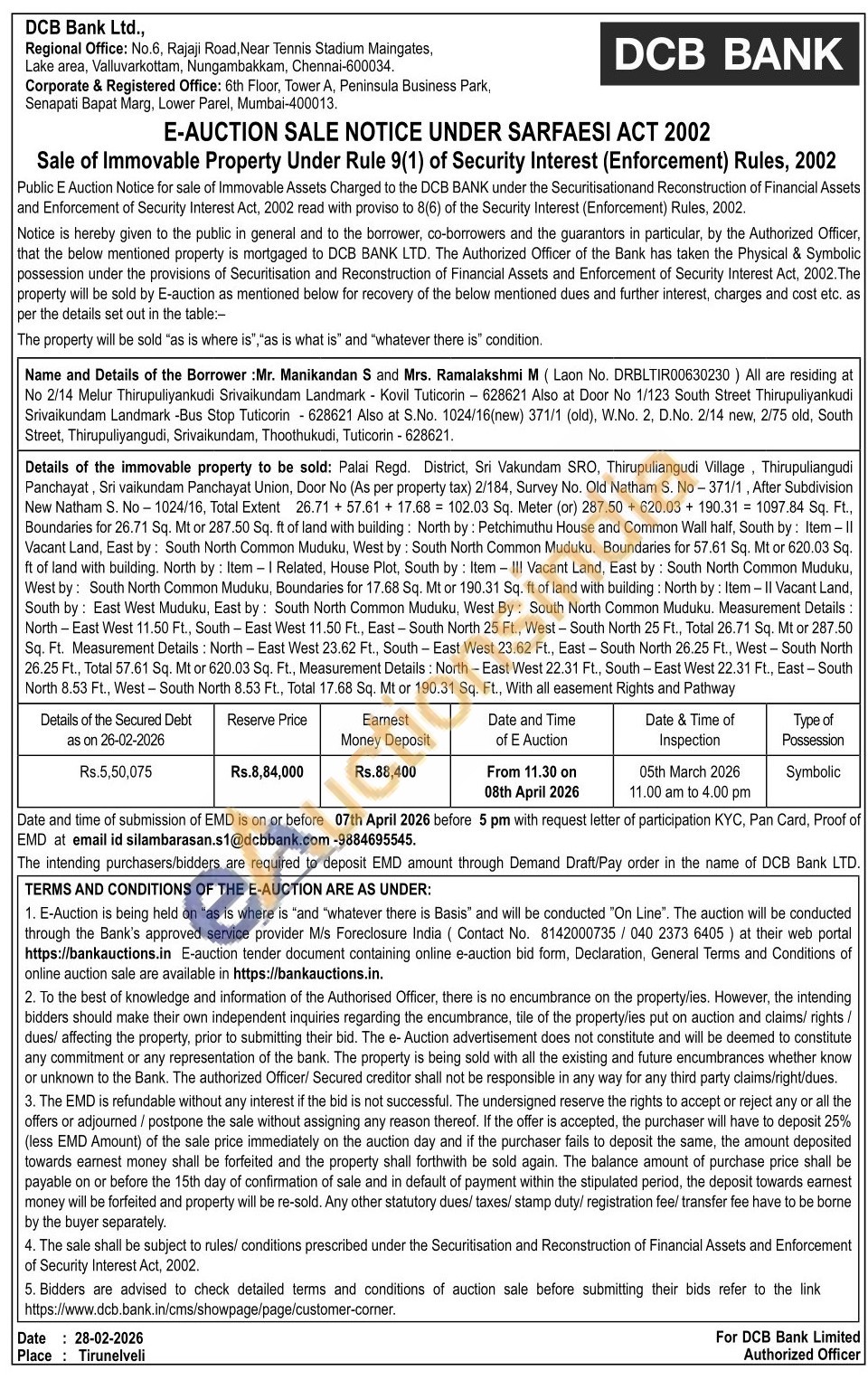 Details of the immovable property to be sold: Palai Regd. District, Sri Vakundam SRO, Thirupuliangudi Village, Thirupuliangudi Panchayat, Sri vaikundam Panchayat Union, Door No (As per property tax) 2/184, Survey No. Old Natham S. No-371/1, After Subdivision New Natham S. No-1024/16, Total Extent 26.71+57.61 + 17.68 102.03 Sq. Meter (or) 287.50 + 620.03 + 190.31 1097.84 Sq. Ft., Boundaries for 26.71 Sq. Mt or 287.50 Sq. ft of land with building: North by: Petchimuthu House and Common Wall half, South by: Item - II Vacant Land, East by: South North Common Muduku, West by: South North Common Muduku. Boundaries for 57.61 Sq. Mt or 620.03 Sq. ft of land with building. North by: Item-I Related, House Plot, South by: Item III Vacant Land, East by: South North Common Muduku, West by: South North Common Muduku, Boundaries for 17.68 Sq. Mt or 190.31 Sq. ft of land with building: North by: Item-II Vacant Land, South by: East West Muduku, East by: South North Common Muduku, West By: South North Common Muduku. Measurement Details North-East West 11.50 Ft., South-East West 11.50 Ft, East-South North 25 Ft., West-South North 25 Ft., Total 26.71 Sq. Mt or 287.50 Sq. Ft. Measurement Details: North-East West 23.62 Ft., South-East West 23.62 Ft., East-South North 26.25 Ft., West-South North 26.25 Ft., Total 57.61 Sq. Mt or 620.03 Sq. Ft., Measurement Details: North-East West 22.31 Ft., South-East West 22.31 Ft., East - South North 8.53 Ft., West-South North 8.53 Ft., Total 17.68 Sq. Mt or 190.31 Sq. Ft., With all easement Rights and Pathway