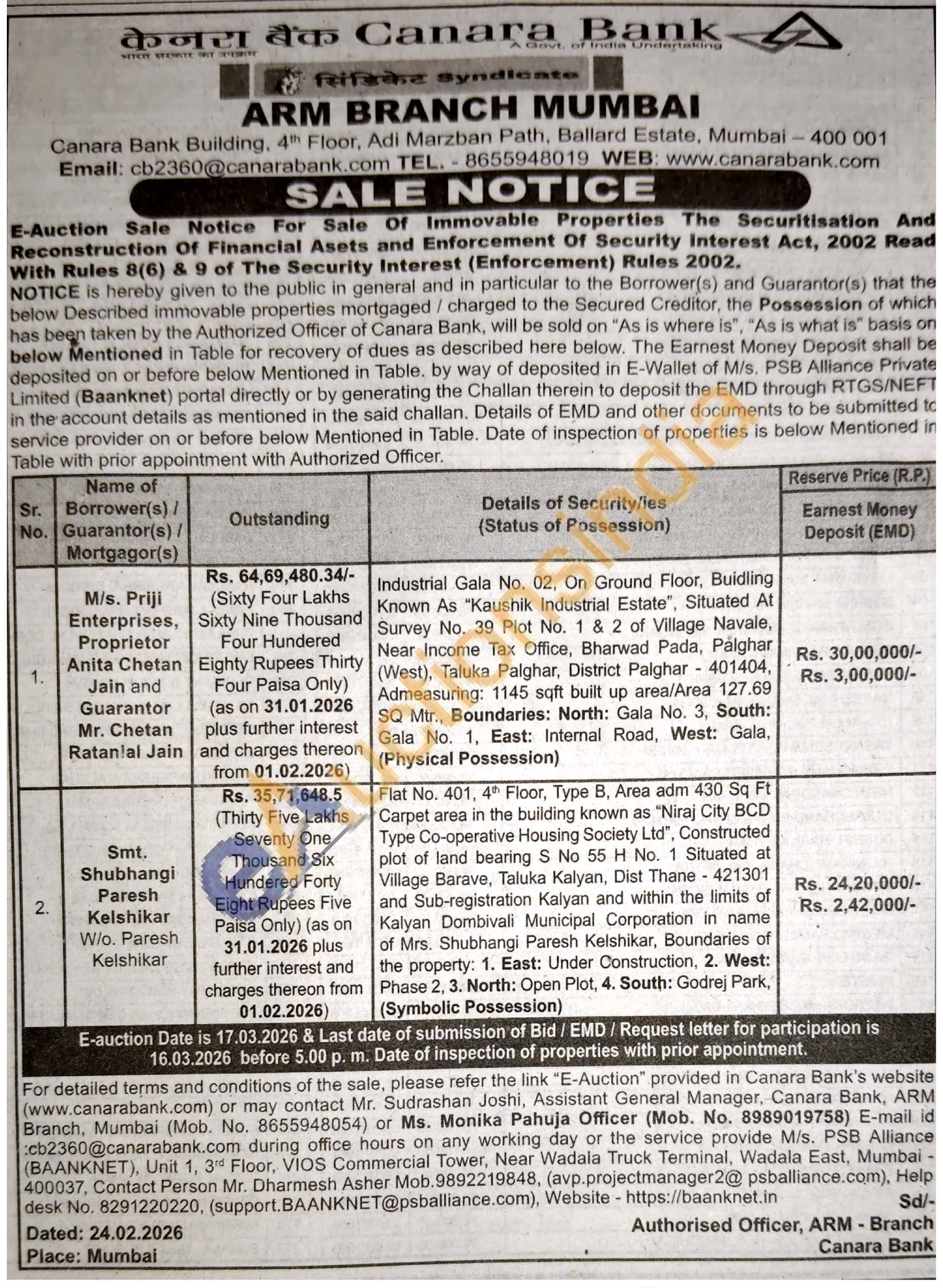 Flat No. 401, 4th Floor, Type B, Area adm 430 Sq Ft Carpet area in the building known as "Niraj City BCD Type Co-operative Housing Society Ltd", Constructed plot of land bearing S No 55 H No. 1 Situated at Village Barave, Taluka Kalyan, Dist Thane - 421301 and Sub-registration Kalyan and within the limits of Kalyan Dombivali Municipal Corporation in name of Mrs. Shubhangi Paresh Kelshikar, Boundaries of the property: 1. East: Under Construction, 2. West: Phase 2, 3. North: Open Plot, 4. South: Godrej Park, (Symbolic Possession)