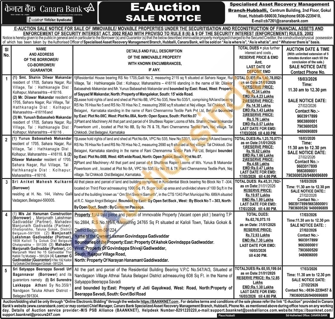 2) 2)Plant and Machinery:-All that part and parcel of 4 Shuttless Rapier Looms of M/s. Yunus B Makandar Powerloom unit, located at Plot No 8A, VPC No 535, Sy No 76 & 78, Rani Chennamma Textile Park, Nej village. Tal Chikkodi. Dist Belagavi, Karnataka.