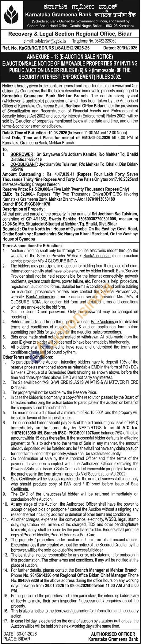 All that part and parcel of the property in the name of Sri Jyotiram S/o Tulsiram, consisting of GP 4/118/2, Swatin Sankhe 150600302700301005, measuring 23.96 Sq.Mtr, Situated at Situated at Mehkar, Tq. Bhalki, Dist. Bidar Bounded: On the North by: House of Gyanoba, On the East by: Govt. Road, On the South by: Ramchandra S/o Narayan Kirani Marchant, On the West by: House of Gyanoba