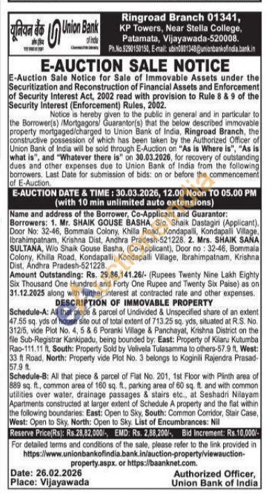 Schedule-A: All that piece & parcel of Undivided & Unspecified share of an extent 47.55 sq. yds of house site out of total extent of 713.25 sq. yds, situated at R.S. No. 312/5, vide Plot No. 4, 5 & 6 Poranki Village & Panchayat, Krishna District on the file Sub-Registrar Kankipadu, being bounded by: East: Property of Kilaru Kutumba Rao-111.11 ft, South: Property Sold by Velivela Tulasamma to others-57.9 ft. West: 33 ft Road, North: Property vide Plot No. 3 belongs to Koginili Rajendra Prasad-57.9 ft Schedule-B: All that piece & parcel of Flat No. 201, 1st Floor with Plinth area of 889 sq. ft., common area of 160 sq. ft., parking area of 60 sq. ft. and with common utilities over water, drainage passages & stairs etc., at Seshadri Nilayam Apartments constructed at larger extent of Schedule A property and the flat within the following boundaries: East: Open to Sky, South: Common Corridor, Stair Case, West: Open to Sky, North: Open to Sky. List of Encumbrances: Nil