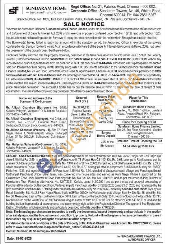 DESCRIPTION OF SECURED PROPERTY: All that piece and parcel of the property comprised in SF No. 266/2, Punjai Hec 2.59.00 (Punjai Acre 6.40) Kist Rs. 2.59, in which an extent of Punjai Acre 0. 78 (Punjai Hec 0.31.40) Kist Rs. 0.63, belongs to Ranjitham as per the present Sub Division Survey No. 266/2G, Patta No. 1340 and in SF No. 266/2, Punjai Hec 2.59.00 (Punjai Acre 6.40) Kist Rs. 2.59, in which an extent of Punjai Acre 1.07 (Punjai Hec 0.43.50) Kist Rs. 0.87, belong to Latha as per present Sub Division Survey No. 266/2F, Patta No. 1339, put together an extent of Pujai Acre 1.85 Kist Rs. 1.50, situated at Vadavedampatti Village and Panchayat Board, Sulthanpet Panchayat Union, Sulur Taluk, was converted into house sites and named as Ram Nagar Phase I, approved by the Coimbatore Zone, Joint Director of Town Planning vide No. Ma. Va. Co. Ma. No. 179/2021 and as per the order of Joint Director of Coimbatore Town Planning vide Na.Ka. No. 3247/2021, Co Ma, dated 14.09.2021 and as per the lay out approval proceeding of Panchayat President of Sulthanpet Union, Vadavedampati Panchayat vide No. 01/2022-2023 dated 23.01.2023 and regularized by the govt authority in which Site No. 37 falling under present Sub Division Survey No. 266/2G68, morefully bounded on the North By: Lay Out Road, South By: Site No. 2.3 Ram Nagar Phase II falls in SF No. 266/2H1 of Vadavedampatti Village, East By: Site No. 38, West By: Site No. 36. Measuring East to West on the North Side: 30 Ft, East to West on the South Side: 30 Ft, North to South on the East Side: 33.7 FL North to South on the West Side: 33.10 Ft admeasuring an extent of 1011 Sq Ft or 93.924 Sq Mtr or 2 Cents 140 Sq Ft of land and the building builtup thereon with all appurtenance and easementary right with in the Registration District of Tiruppur and Sub Registration District of Palladam which is morefully and particularly descnbed in the title deed No. 7746/2024.