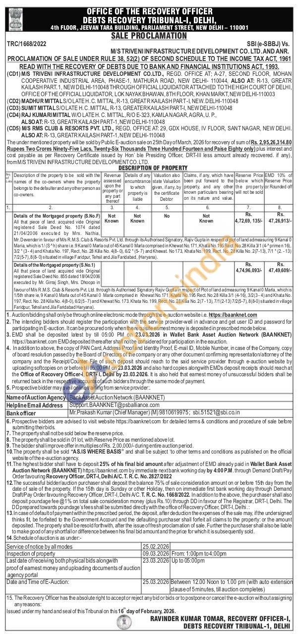 Details of the Mortgaged property (S.No.1) All that piece of land acquired vide Original registered Sale Deed No. 855 dated 18/04/2006 executed by Mr. Ginaj Singh, Mrs. Dhoopo in favour of Mis R.M.S. Club & Resorts Pvt. Ltd. through its Authorised Signatory Rajiv Gupta in respect of Plot of land admeasuring 9 Kanal 0 Marfa, which is 1/5th share ie, 9 Kanal0 Marta out of 45 Kanal 0 Maria comprised in Khewat No. 171, Khata No. 195 Rect No. 28 Killa 3/1 (4-16), 3/2(3-4) and Khata No. 197, Rect No. 28 Killa No. 4/8-0), 6/2(5-7) and Khewat No. 173. Khata No. 199, Rect. No. 28 Killa No. 2(7-13), 7/1(2-13) 7/2(5-7), 8(8-0) situated in village Faridpur, Tehsiland Jila Faridabad Haryana)
