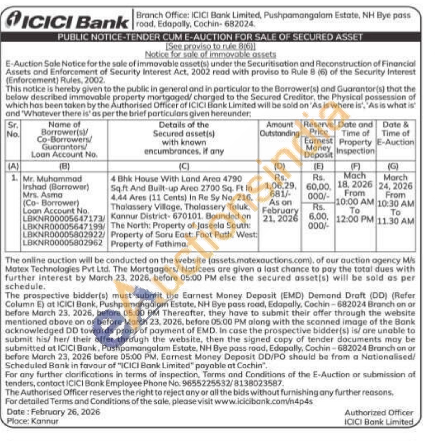 4 Bhk House With Land Area 4790 Sq.ft And Built-up Area 2700 Sq. Ft In 4.44 Ares (11 Cents) In Re Sy No. 216, Thalassery Village, Thalassery Taluk, Kannur District-670101. Bounded on The North: Property of Jaseela South: Property of Saru East: Foot Path. West: Property of Fathima.
