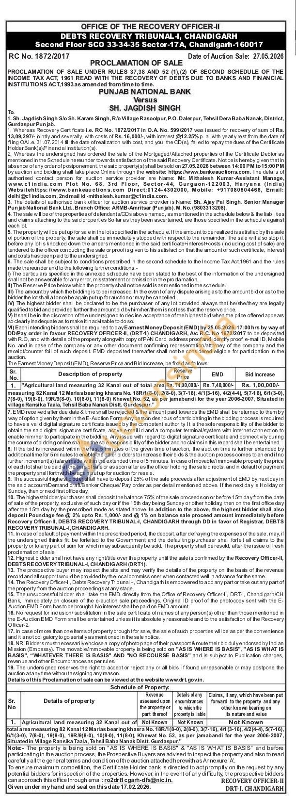 Agricultural land measuring 32 Kanal out of total area measuring 82 Kanal 12 Marlas bearing khasra No. 18R/1(8-0), 2(8-0), 3(7-16), 4/1(3-16), 4/2(4-4), 5(7-16), 6/1(3-0), 7(8-0), 19(8-0), 19R/9(8-0), 10(8-0), 11(8-0) Khewat No. 52, as per jamabandi for the year 2006-2007, Situated in village Ransika Taala, Tehsil Baba Nanak Distt. Gurdaspur