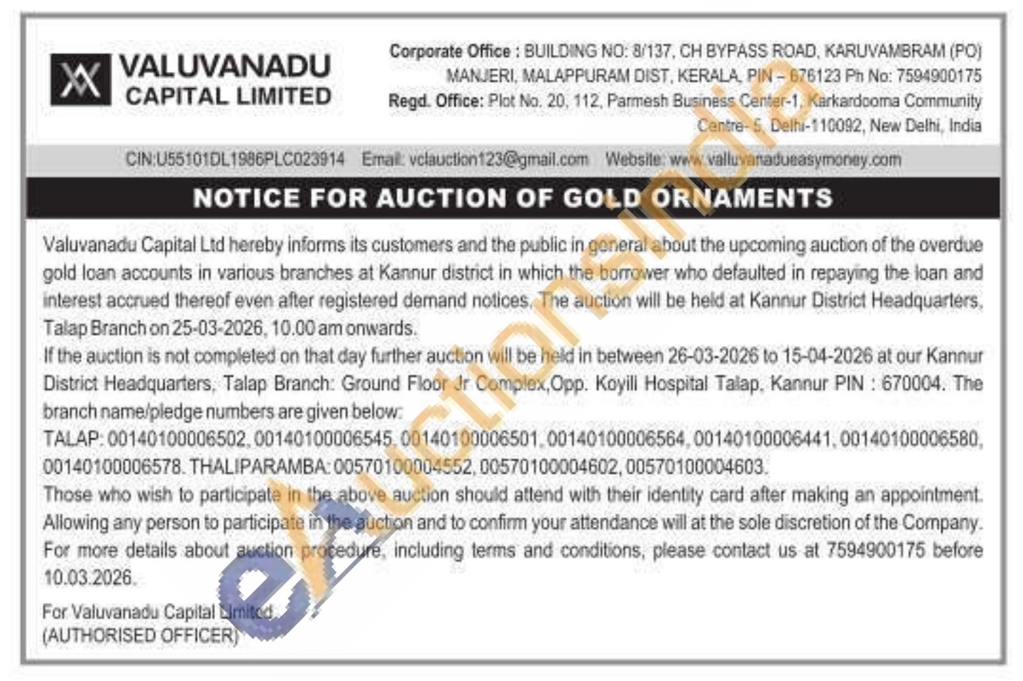 Valuvanadu Capital Limited Gold Auctions Auction in Kannur