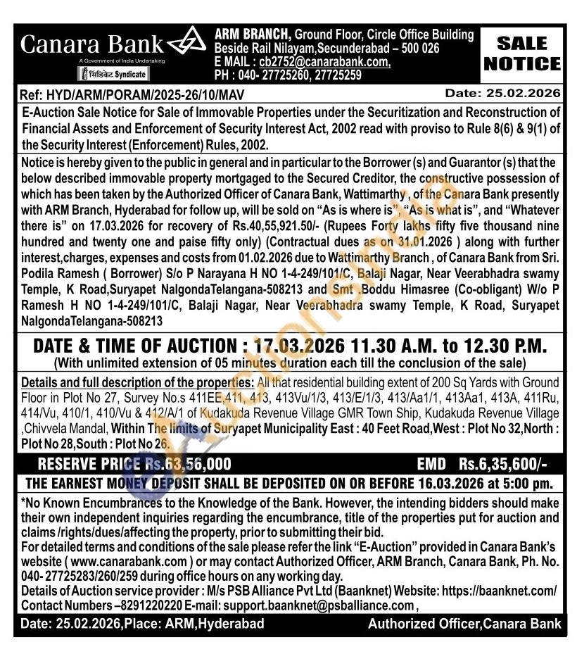 Details and full description of the properties: All that residential building extent of 200 Sq Yards with Ground Floor in Plot No 27, Survey No.s 411EE,411, 413, 413Vu/1/3, 413/E/1/3, 413/Aa1/1, 413Aa1, 413A, 411Ru, 414/Vu, 410/1, 410/Vu & 412/A/1 of Kudakuda Revenue Village GMR Town Ship, Kudakuda Revenue Village Chivvela Mandal, Within The limits of Suryapet Municipality East: 40 Feet Road, West: Plot No 32, North: Plot No 28, South: Plot No 26.