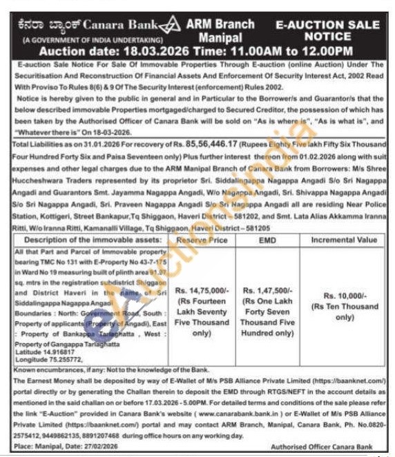 All that Part and Parcel of Immovable property bearing TMC No 131 with E-Property No 43-7-175 in Ward No 19 measuring built of plinth area 91.97 sq. mtrs in the registration subdistrict Shiggaon and District Haveri in the name of Sri Siddalingappa Nagappa Angadi Boundaries: North: Government Road, South Property of applicants (Property of Angadi), East Property of Bankappa Tarlaghatta West Property of Gangappa Tarlaghatta Latitude 14.916817 Longitude 75.255772