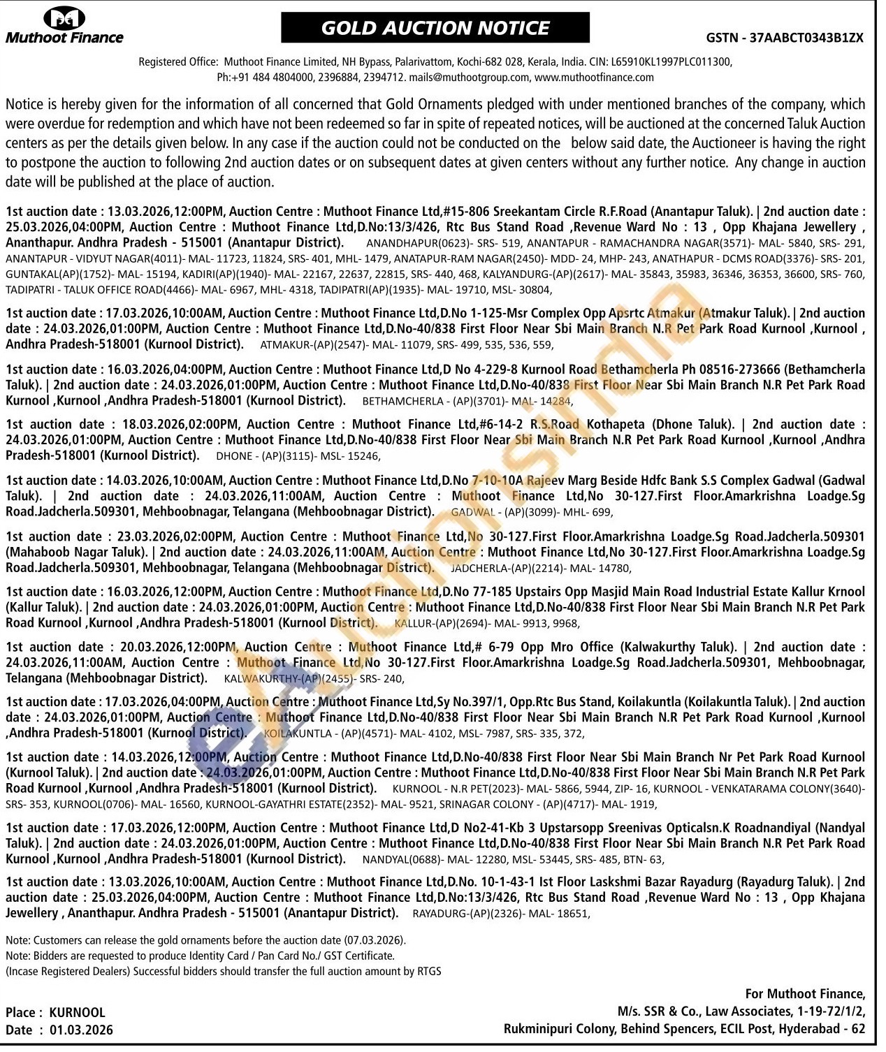 Muthoot Finance Ltd Gold Auctions Auction in Kurnool
