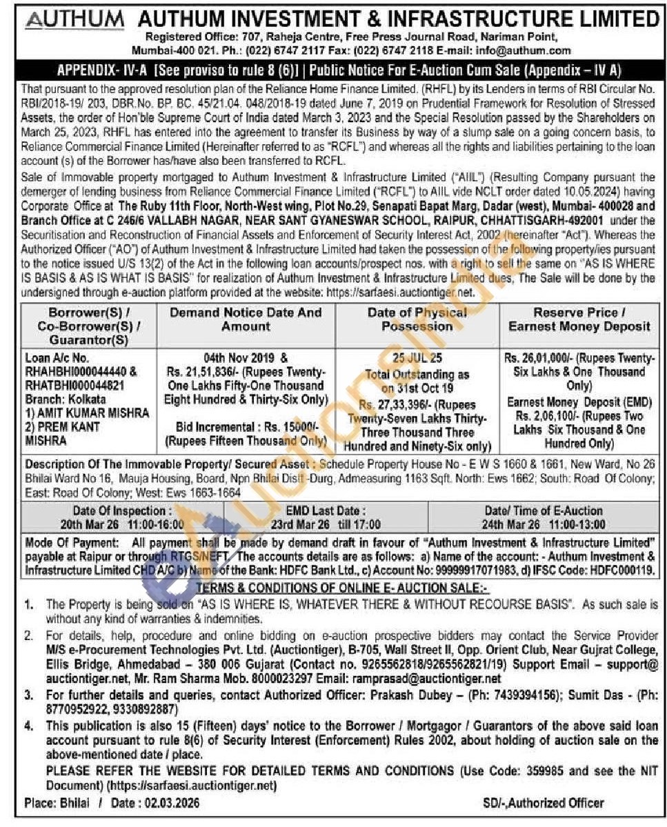 Schedule Property House No-EWS 1660 & 1661. New Ward, No 26 Bhilai Ward No 16, Mauja Housing, Board, Npn Bhilai Distt-Durg, Admeasuring 1163 Sqft. North: Ews 1662; South: Road Of Colony, East: Road Of Colony; West: Ews 1663-1664