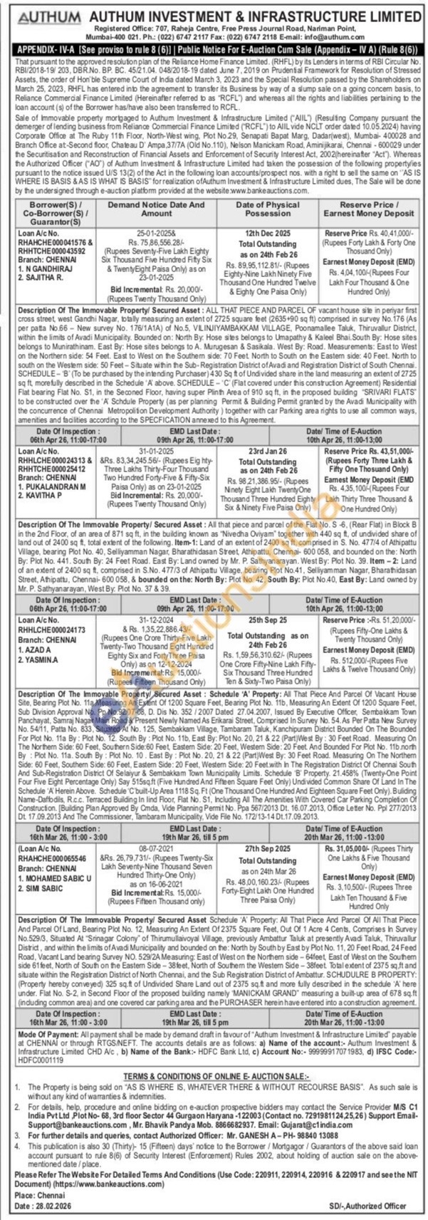 All That Piece And Parcel Of All That Piece And Parcel Of Land, Bearing Plot No. 12, Measuring An Extent Of 2375 Square Feet, Out Of 1 Acre 4 Cents, Comprises In Survey No.529/3, Situated At "Srinagar Colony" of Thirumullaivoyal Village, previously Ambattur Taluk at presently Avadi Taluk, Thiruvallur District, and within the limits of Avadi Municipality and bounded on the: North by South by East by Plot No. 11, 20 Feet Road, 24 Feed Road, Vacant Land bearing Survey NO. 529/2A Measuring: East of West on the Northern side-64feet, East of West on the Southern side 61 feet, North of South on the Eastern Side-38 feet, North of Southern the Western Side-38feet. Total extent of 2375 sq.ft and situate within the Registration District of North Chennai, and the Sub Registration District of Ambattur. SCHUDULRE B PROPERTY: (Property hereby conveyed) 325 sq.ft of Undivided Share Land out of 2375 sq.ft and more fully described in the schedule 'A' here under. Flat No. S-2, in Second Floor of the proposed building namely 'MANICKAM GRAND measuring a built-up area of 678 sq.ft (induding common area) and one covered car parking area and the PURCHASER herein have entered into a construction agreement.