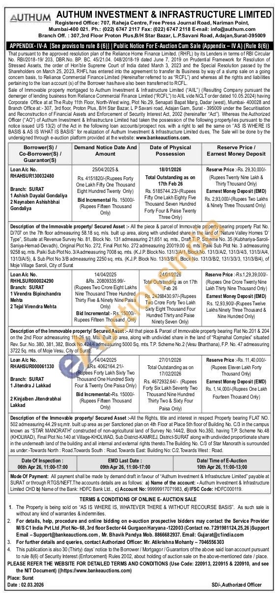 Description of the Immovable property/ Secured Asset: All the Rights, title and interest in respect Property bearing FLAT NO. 502 admeasuring 44.29 sqmtr. built up area as per Sanctioned plan on 4th Floor at Place 5th floor of Building No. C13 in the campus known as "STAR MANORATH constructed of non-agricultural land of Survey No. 144/2, Block No.350, having T.P. Scheme No.48 (KHOLWAD), Final Plot No.140 at Village-KHOLWAD, Sub District-KAMREJ, District-SURAT along with undivided proportionate share in the underneath land of the building and all intemal and extemal rights thereto. The Building No. C/3 of Star Manorath is surrounded as under-Towards North: Road. Towards South Road. Towards East: Building No. C/2. Towards West: Road