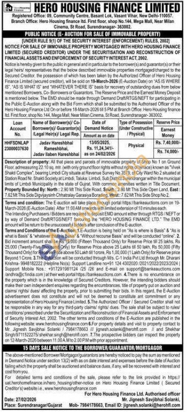 Description of property: All that piece and parcels of immovable property of Shop No 1 on Ground Floor, admeasuring 22.10 sq mir. (wilth only ground floor rights without rights of terrace) known as "Vivek Shakti Complex", bearing Limbdi City situate at Revenue Survey No.3579, of City Ward No 2 situated at Station Road Nr. Shaks Society at Limbdi, Taluka Limbdi, Sub District Surendrangar within the municipal limits of Limbdi Municipality in the state of Gujrat. With common amenities written in Title Document Property Bounded By: North: 2.90 Mt This Side Road, South: 2.90 Mt This Side Open Land, East: 7.62 Mt This Side Digvijaysinh Chhatralay Gerasiya Borading, West: 7.62 Mt This Side Shop No 2