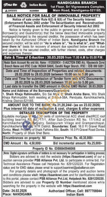 DETAILED DESCRIPTION OF THE PROPERTY : Equitable mortgage of AC 1.50 cents of commercial ACC sheet shed/RCC roof building bearing RS No. 17/1, After Sub-Division RS No. 17/1/A/2 at Kanchikacherla Sub-Registry, Saidapuram Village and Grampanchayat, Kanchikacheria Mandal, NTR District. Boundaries: East: 16.0 Ft Gravel Road Donka, West: Property of Shaik Fathima Bibi, South: 16.0 Ft Gravel Road Donka, North: Property of Shaik Shet Bano