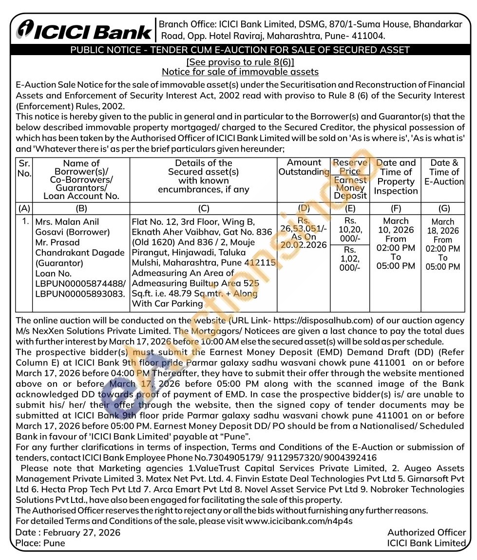 Flat No. 12, 3rd Floor, Wing B, Eknath Aher Vaibhav, Gat No. 836 (Old 1620) And 836/2, Mouje Pirangut, Hinjawadi, Taluka Mulshi, Maharashtra, Pune 412115 Admeasuring An Area of Admeasuring Builtup Area 525 Sq.ft. i.e. 48.79 Sq.mtr. + Along With Car Parking
