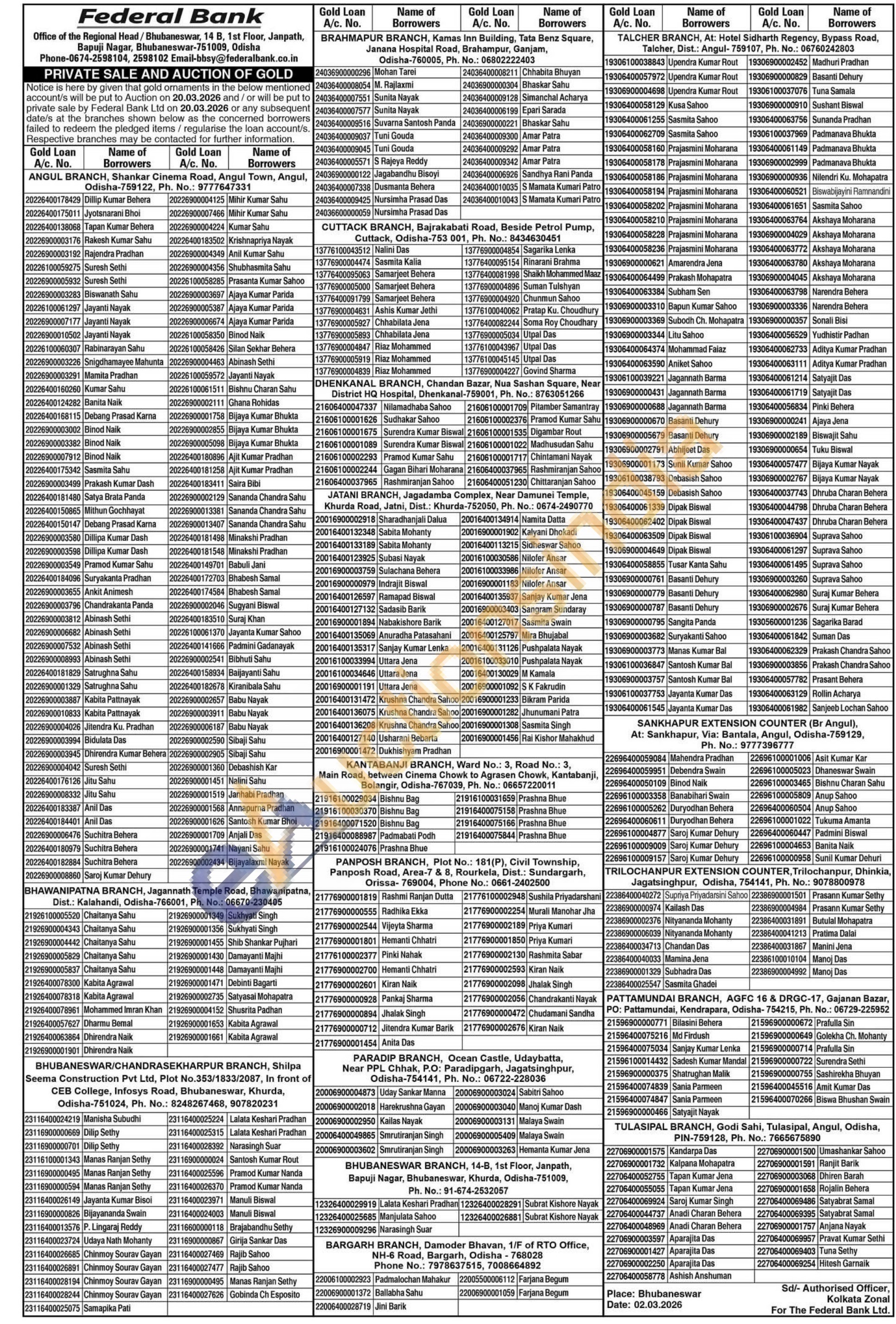 Federal Bank Gold Auctions Auction in Bhubaneswar