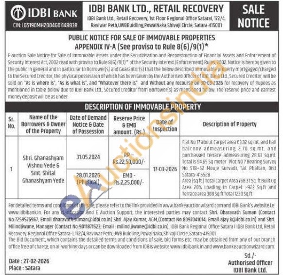 Flat No 17 about Carpet area 63.32 sq.mt, and hall balcony admeasuring 2.70 sq mt, and purchassed terrace admeasuring 28.63 sq.mt. Total is 94.65 Sa meter Plot NO7 Bearing Survey No 518-52 Mouje Survadi, Tal. Phaltan, Dist Satara 415528 Area (sq ft.) Total Carpet Area 7683750 ft Built up Area 20% Loading in Carpet: 922 50 ft and Terrace area 308 Soft Total 1230 5q.ft
